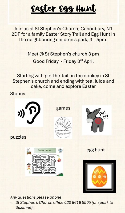 On Easter Sunday, if anyone is not sure how to get to St. Jude’s, please come to St. Stephen’s at 10 am for coffee in the church and at 10.30, we leave to catch the bus from Essex Road to go St. Jude’s together.